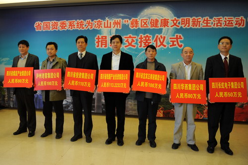 4月8日,省国资委系统举行了为凉山州“彝区健康文明新生活运动”捐款仪式,省委常委、省人大常委会副主任、省国资委党委书记王少雄,省人大常委会副主任、省国资委主任彭渝,省政府副省长张作哈出席捐款仪式,省国资委系统69家企业共捐款1044万元。