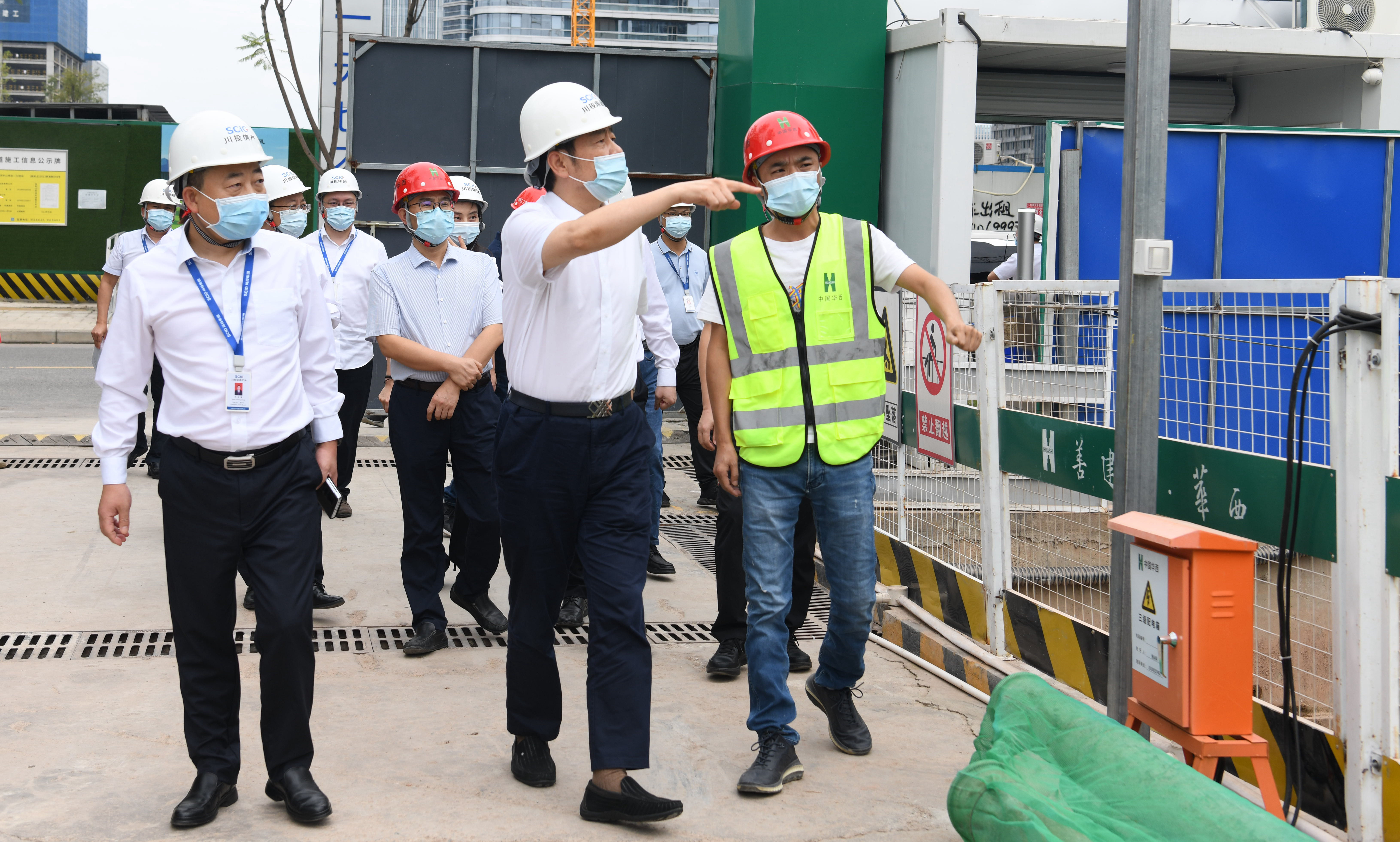 邓凯一行实地检查了川投信息产业总部基地项目施工现场,并对项目设计规划、施工建设进展、疫情防控、安全生产与党建宣传等进行了工作指导。随后,邓凯一行前往川投信产本部开展督导检查,查阅了相关台账,并听取了川投信产综合大检查的工作汇报。