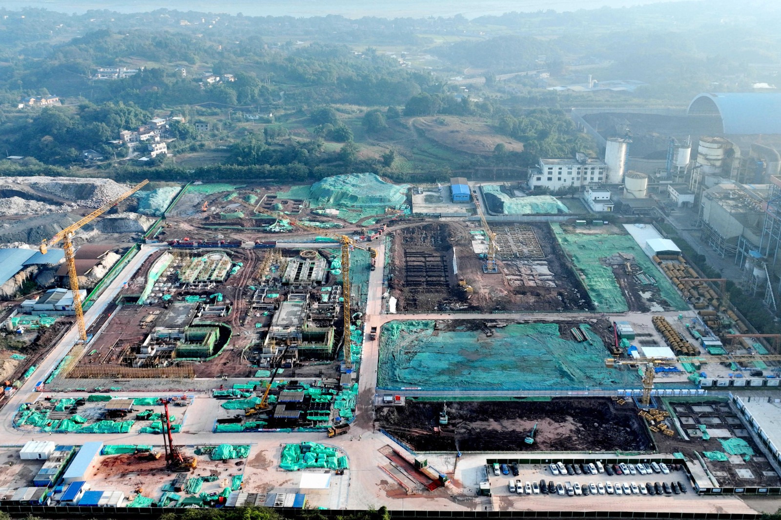 在川投泸州天然气项目建设现场,各种机械高速运转,塔吊错落矗立,施工车辆来回穿梭,作业工人紧张忙碌,处处洋溢着大干快干的激情与热潮。为抢抓工期,泸州气电在开工前就高效陆续完成了主机设备采购、参建单位的招标及合同签订,并组织工程监理、EPC总承包、造价咨询等单位按合同约定提前入场开展项目施工前期筹备工作,在项目开工令签发后快速形成了施工能力,先后如期完成了主厂房第一罐混凝土浇筑、主厂房桩基工程开工、主厂房基础出零米三大里程碑节点,为后续工程节点的顺利实现打下良好的基础。目前,项目智慧工地系统已完成建设,模块化管理初步形成,主厂房区域地下设施基础施工和土方回填、余热锅炉区域基础施工及冷却塔、行政综合楼、备班楼区域土方开挖等工作正同步推进,各施工作业面全面铺开。