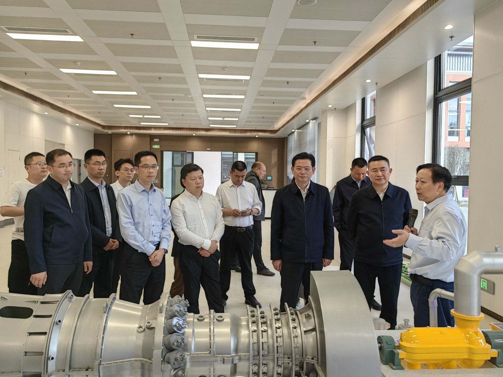 梁红兵向蔡邦银一行详细介绍了资阳燃气电站项目装机规模、燃气发电的生产流程以及投产后的经济和社会效益等情况。