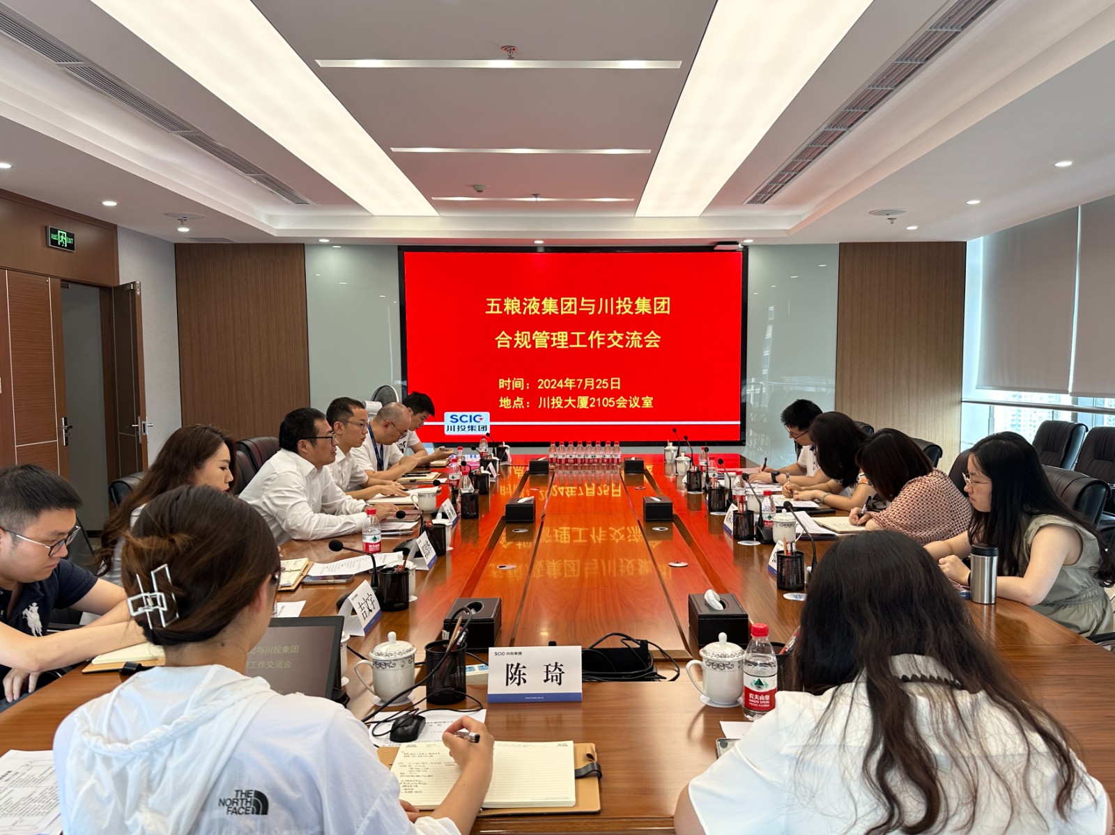 725下午四川省宜宾五粮液集团有限公司(以下简称“五粮液集团”)战略发展部负责人及相关人员到访川投集团,双方就企业合规管理工作展开交流。集团公司总法律顾问、法务风控部部长杨帆主持交流会议