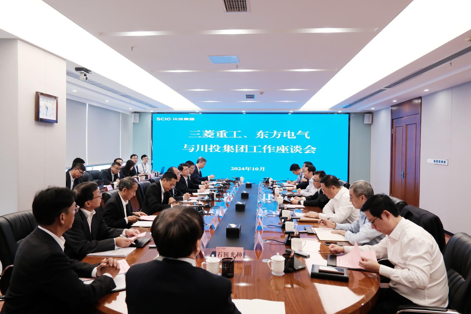 10月14日,三菱重工业株式会社(以下简称“三菱重工”)能源集团CEO土师俊幸、东方电气股份有限公司(以下简称“东方电气”)副总裁李建华一行到访川投集团,开展工作座谈。集团公司党委书记、董事长吴晓曦,党委副书记、副董事长、总经理李文志出席会议。