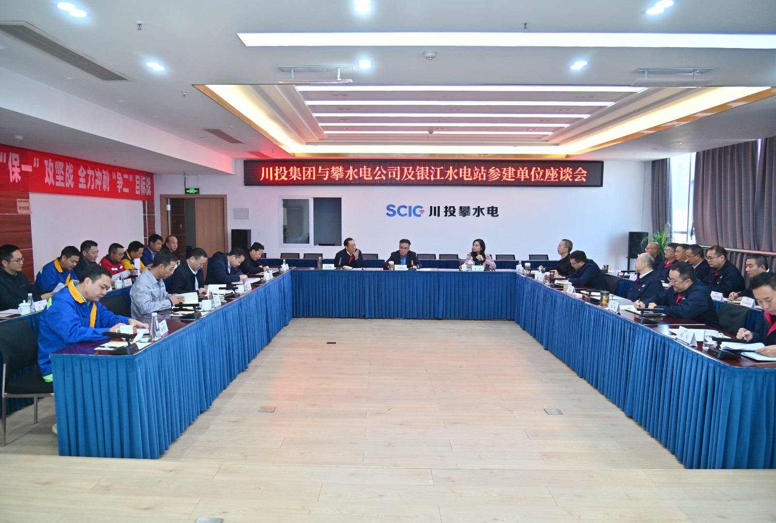 随后,吴晓曦一行座谈听取了项目工程建设、投产计划、科研创新等情况汇报,充分肯定了工程项目的阶段性成绩,并向参建各方的辛勤付出表示感谢。他强调,作为省级重点项目,银江水电站承载着攀枝花市民的美好期待,高质量建成投产达效意义重大。参建各方要千方百计保进度,密切配合、攻坚克难,确保年底首台机组发电;要千方百计保质量,坚持高标准、严要求,确保施工规范、质量过硬,努力打造标杆工程;要千方百计保安全,压紧压实安全生产责任,落实落细安全防护措施,坚决遏制事故发生。要认真履行国企责任,杜绝拖欠和克扣农民工工资,确保安全稳定和谐。会上,朱莉对安全、环保、维稳等工作作出具体安排。
