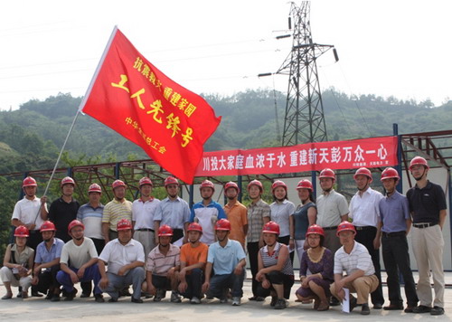 授旗仪式结束后,大家在鲜红的“工人先锋号”旗帜下合影,从废墟中站起来的天彭电力广大职工们脸上露出了自豪的笑容。望着迎风招展的红旗,郭勇总经理笑着问大家准备把这面光荣的旗帜插在哪里,同志们高声回答:报告郭总,报告各位领导,我们要把“工人先锋号”的红旗插遍天彭电力抗震救灾、重建家园的每一个阵地!