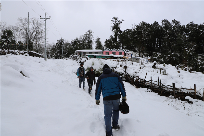 七个小时的车程,从充满阳光的加德满都,顺着蜿蜒的山路向西北方向前进,已知的,是一路颠簸的车程,未知的,是等在目的地漫天的风雪。承担这次任务的主要人员是合资公司副总经理Pratik先生和员工Yam,刚到营地,他们就向现场人员了解听证会的准备情况。平生多磨砺,勇者自前行。项目营地周边的雪越下越大,大雪将山区道路彻底阻断,大家正寻求办法之际, Pratik先生果断地说了一句:“Let's go!”,参加听证会的合资公司、清源公司和NESS一行人没有任何犹豫,果断背起干粮,徒步前往目的地Koto村。在风雪中这一走就是9公里!漫天风雪中,作为公司尼方员工Pratik领行的背影显得些许渺小,坚定的步伐又显得那么伟岸。中尼双方员工携手前行,一步一个脚印向前挪动。大家知道眼前困难是暂时的,也期待着中尼合作项目春来花开的那天,中尼两国人民的友谊也会在喜马拉雅之巅结出胜利的果实。