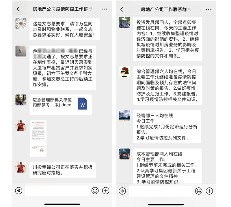 居家网络办公,变的是工作地点,不变的是川房人对公司的责任。2月10日公司开始有序复工,为保障公司和员工的安全,实行带班领导+部门负责人+一般员工到川投大厦值班值守、其余人员居家办公的工作模式,通过“川投云平台”、“企业微信”等在线办公软件进行工作沟通,明确工作内容和目标,带着问题和解决办法进行会议和日常交流。在线对每日进行工作总结和复盘,确保疫情防控期间各项工作不断档、不脱节。