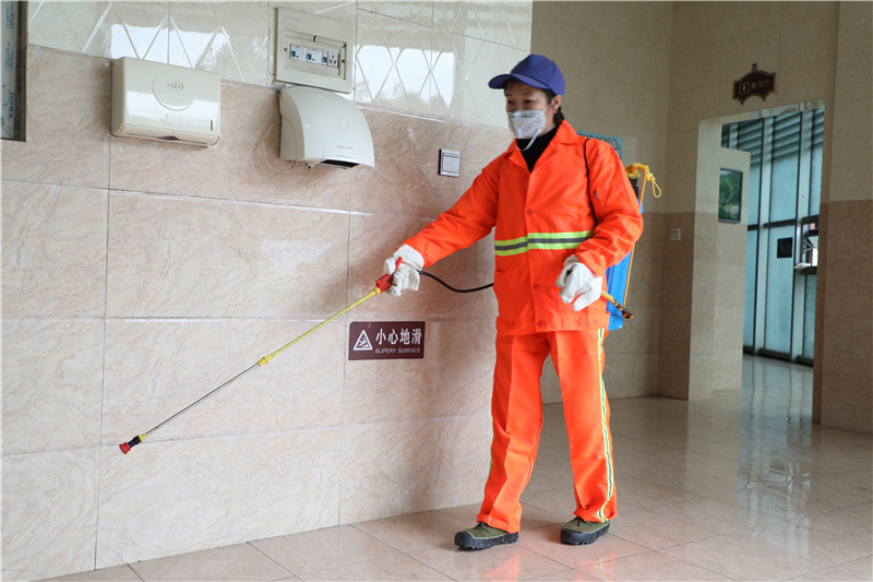按照预定计划,环卫班消毒范围包括新老两个矿区和一个石溪片区,矿区中一个观音溪花园面积就达5000平方米,细算下来消毒区域达数万平方米!“出门戴口罩,别去凑热闹……”耳旁不时传来防疫宣传知识和举措,原来在绿化班常常形影不离的邓容和邓琼两姐妹因分工区域不同,第一天抗“疫”却要分开了,而且必须到处串,所到之处必须消毒无遗漏,她们深知防疫工作最终要落实到基层,落实到每个人的行动,自己的岗位正是基础中的重中之重!