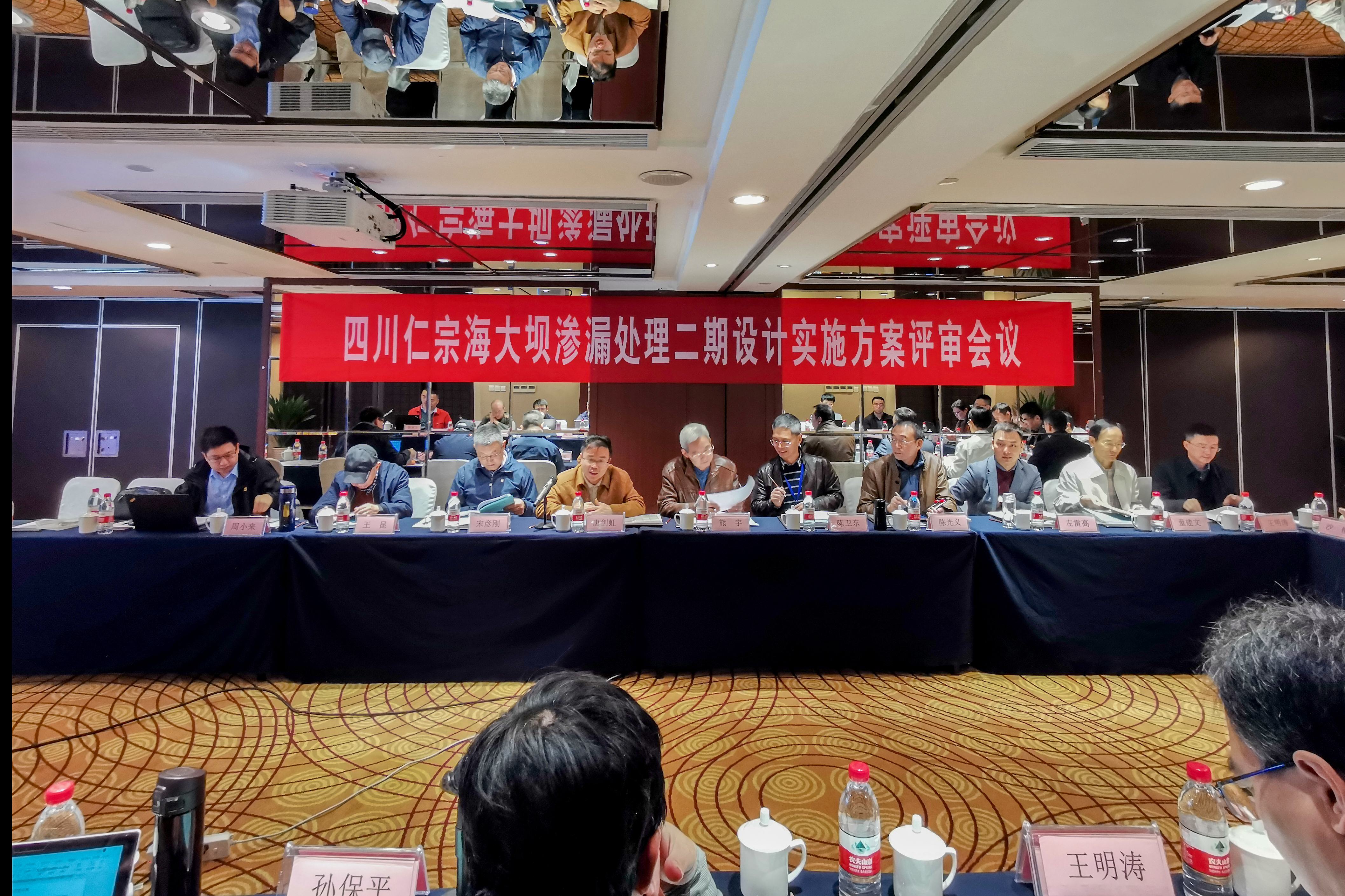 会上,专家们首先听取了成都院关于《四川省田湾河仁宗海水库电站大坝渗漏二期第一阶段处理实施方案设计报告(评审稿)》的汇报,主要包括大坝渗漏处理二期第一阶段设计、施工组织设计、工程投资与结论及建议;然后,与会专家根据仁宗海大坝历次渗漏处理、现场检测、原型观测及大坝安全首次定期检查要求,结合国内同类型工程渗漏及其处理情况,重点对大坝渗漏原因及渗漏部位、渗漏处理灌浆试验、材料与工艺、坝面复合土工膜施工、二期处理工期等进行了深入讨论。最后,通过评审专家与参会技术人员共同努力,仁宗海大坝渗漏二期处理设计实施方案通过了专家评审,确定了大坝渗漏二期处理设计实施方案,并形成《四川田湾河仁宗海水电站大坝渗漏处理二期设计实施方案评审意见》。