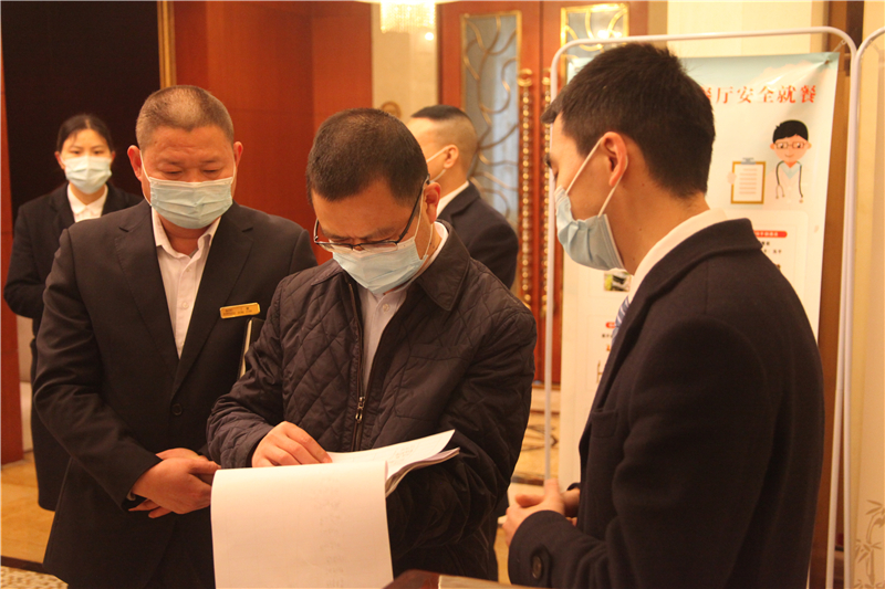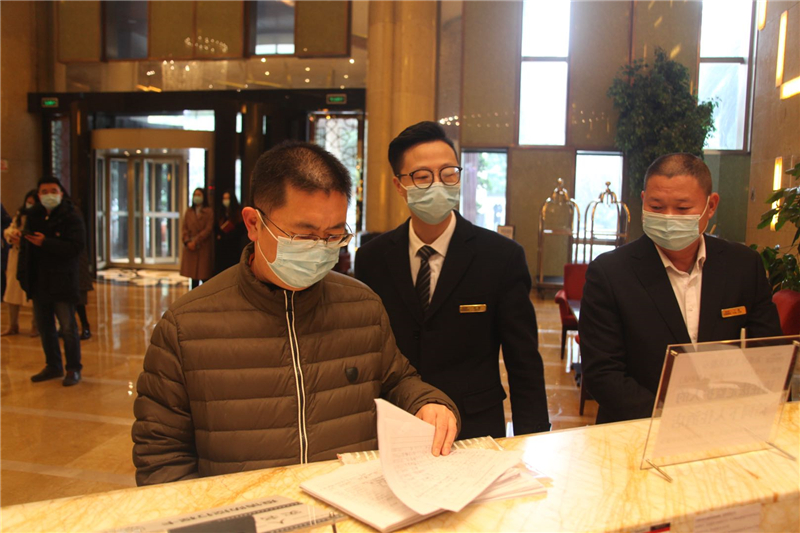 杨书记一行深入公司东大门、员工宿舍、酒店,详细检查了东大门疫情防控工作和厨房食品留样记录,并抽问了酒店前台工作人员入住登记流程。