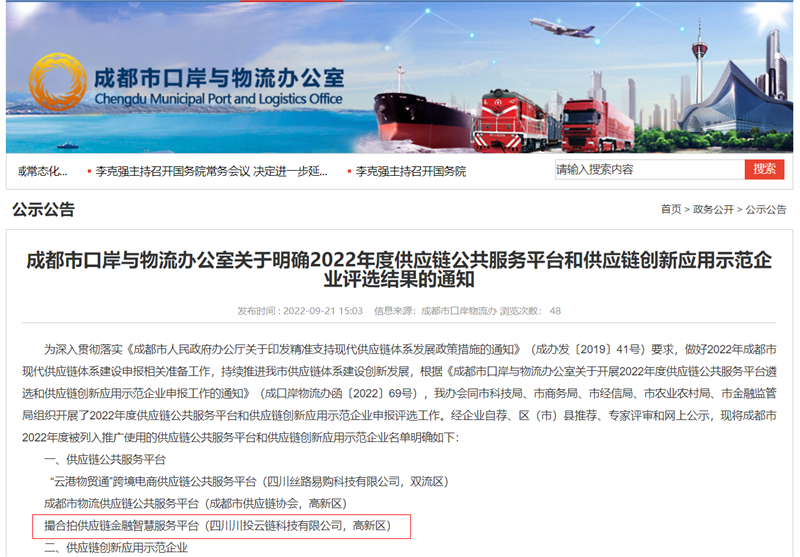 9月21日,成都市口岸与物流办公室发布了关于明确2022年度供应链公共服务平台和供应链创新应用示范企业评选结果的通知。川投信产所属川投云链公司报送的“撮合拍供应链金融智慧服务平台”,在此次评选中正式获得了供应链公共服务平台认定,成为成都市3家获得认定的平台之一。