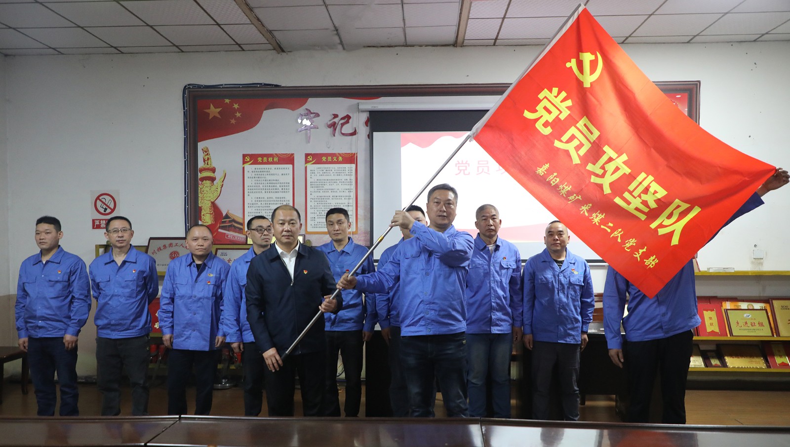 4月25日,嘉阳煤矿采煤二队党支部在党群活动室举行“党员攻坚队”授旗仪式,公司党委副书记、总经理范勤英授予党支部“党员攻坚队”旗帜,鼓励党员干部带领全队职工紧跟新质生产力发展步伐,进一步挖掘智能化综采优势,确保生产安全高效。