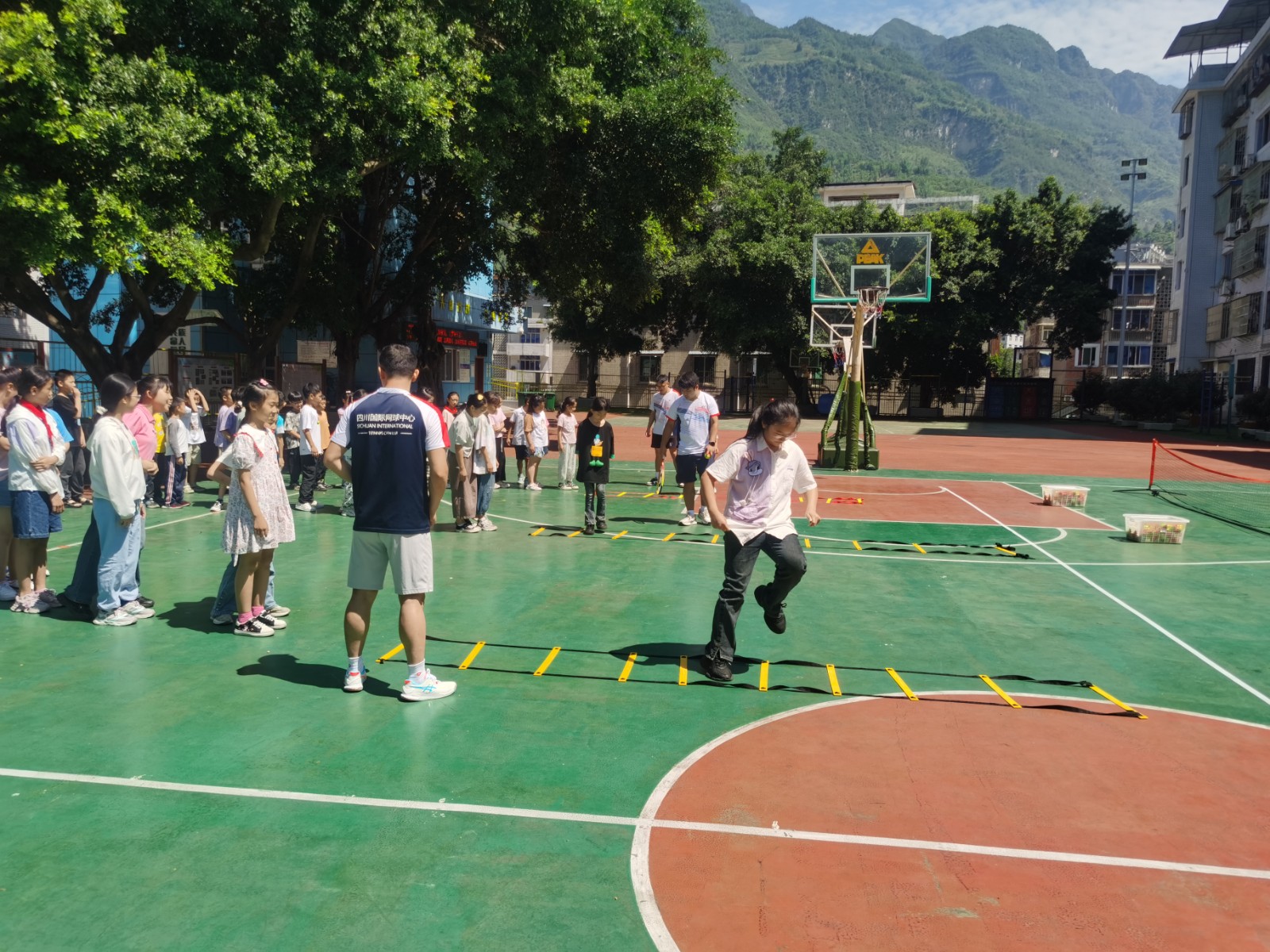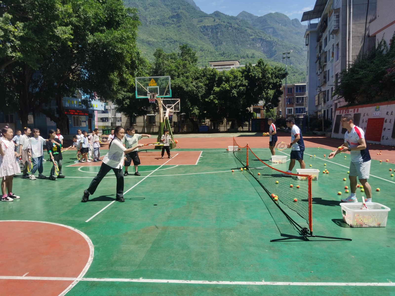 在操场上,川投国网公司派出网球教学经验丰富的教练团队,从网球运动基础知识普及、基础技术动作指导体验、网球小游戏等方面开拓学生体育视野,激发学生体育项目兴趣,促进体教融合及学生全面发展。