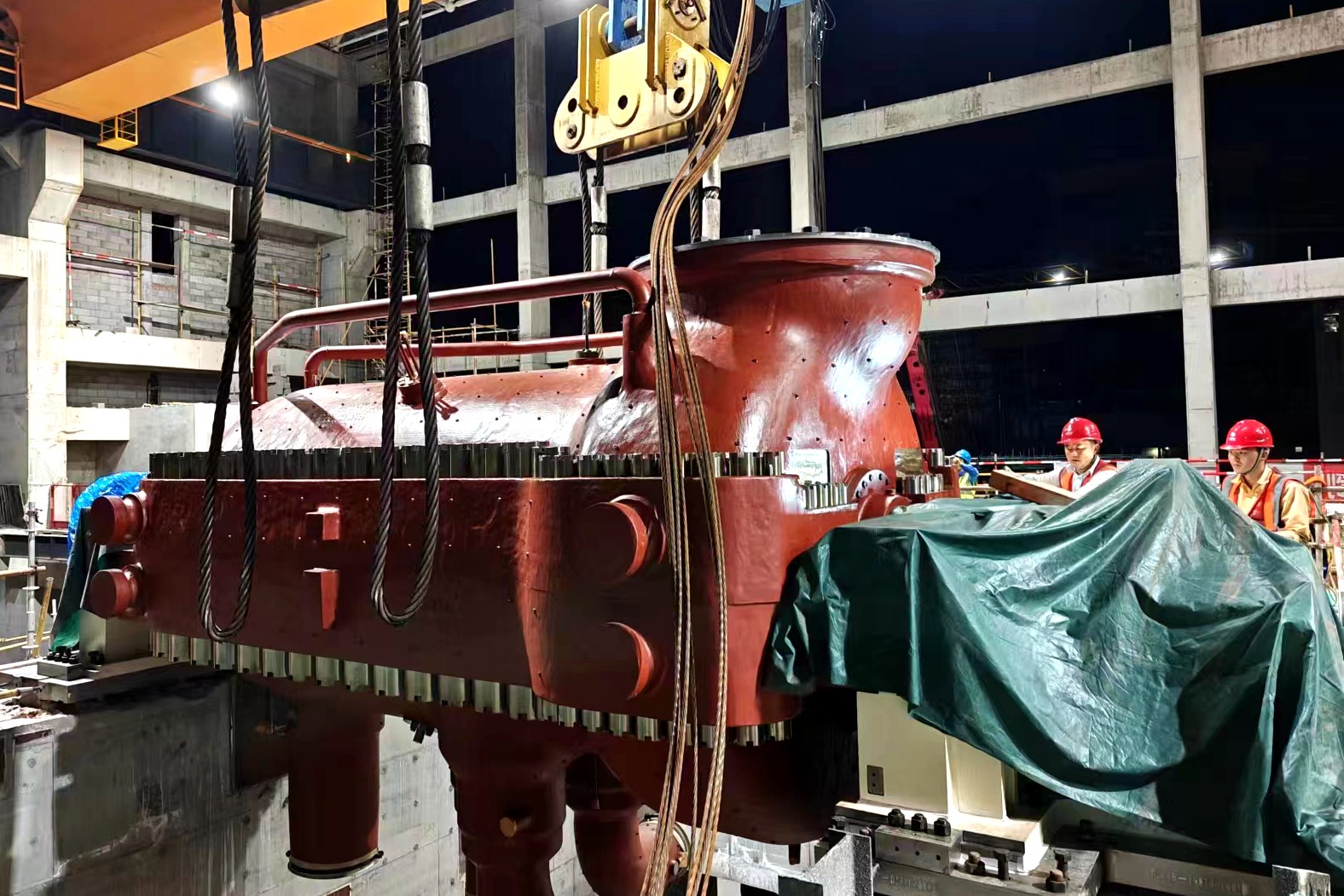 项目汽轮机部分高中压缸采用模块化设计,长8.9米、宽3.7米、高4.5米,重170吨,现场采用两台行车和液压提升装置联合吊装方式进行吊装。