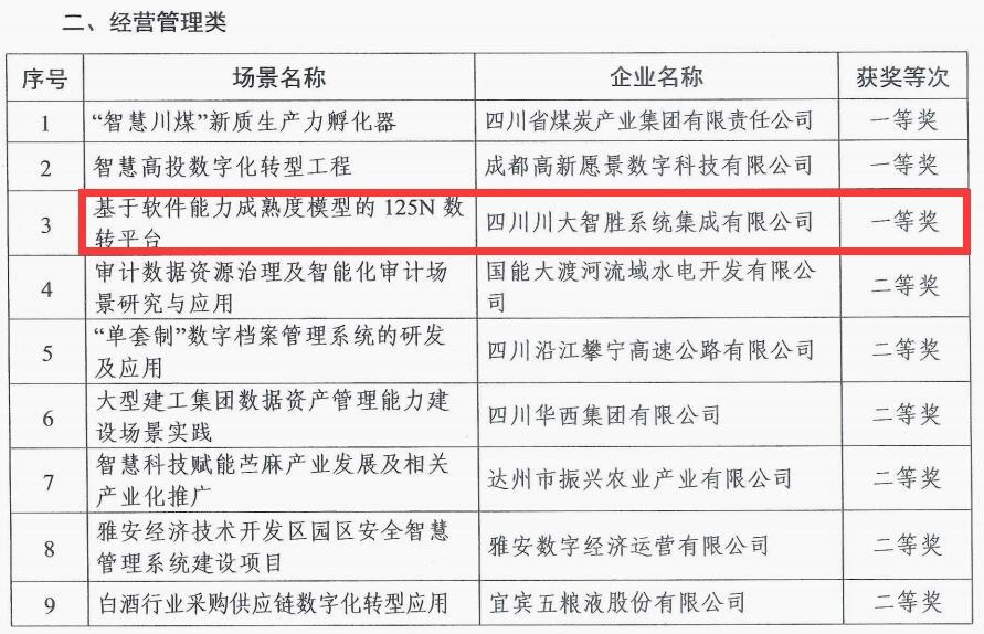 近日,四川省国资委公布全省国资国企数字化转型优秀场景评选获奖名单,公司所属智胜集成选送的“基于软件能力成熟度模型的125N数转平台”从全省国资国企推报的196个数字化转型场景中脱颖而出,获经营管理类一等奖。