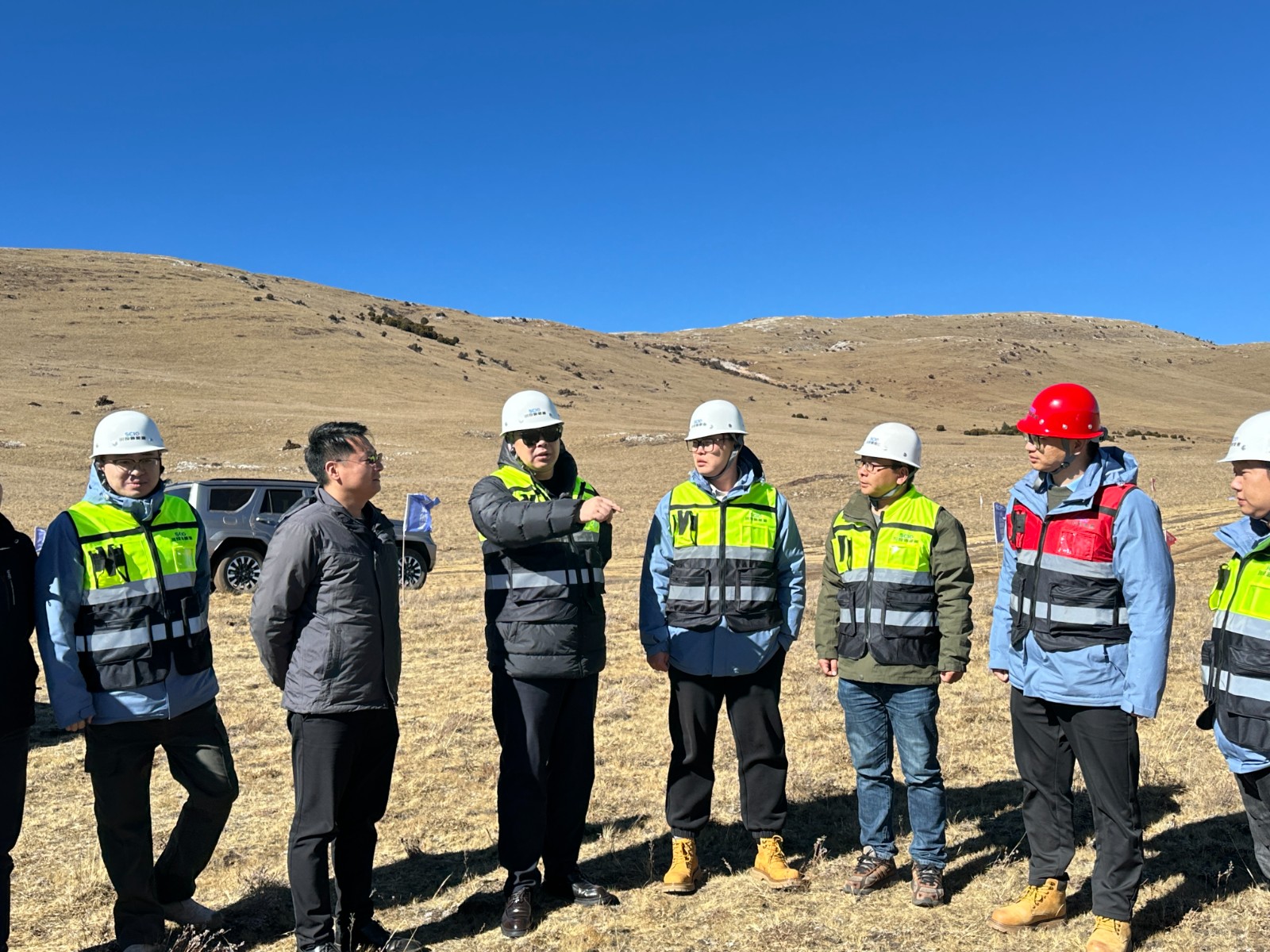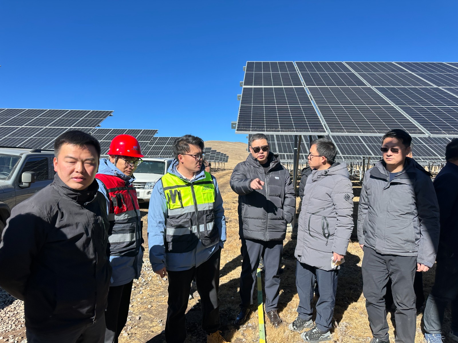 刘亮一行深入现场,详细了解了项目开工仪式工作进展和项目建设推进计划,调研了周边已投运的光伏电站建设、运行情况,听取了EPC总承包单位、监理单位、对于资源配置、营地建设、施工安全、质量管控等计划的工作汇报。刘亮对各参建单位在艰苦环境中为开工仪式及项目建设所做工作表示肯定,并对下一步工作提出具体要求,针对项目现场极端天气,要求总承包单位开工前务必强化施工安全及防火措施,严防草原火灾隐患,强化后勤保障工作。
