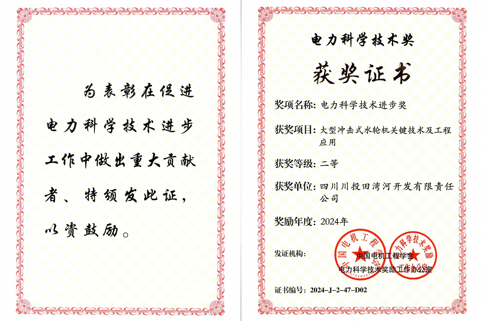 近日,川投田湾河公司与东方电气集团东方电机有限公司联合研究的金窝电站《大型冲击式水轮机关键技术应用》获得中国电机工程学会电力科学技术奖进步奖“二等奖”。